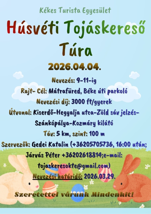 A Kékes Turista Egyesület szeretettel meghívja a természetkedvelő Kicsiket és Nagyokat, egy vidám Húsvéti Tojáskereső túrára, hogy segítsenek megtalálni az erdőben elrejtett hímestojásokat!