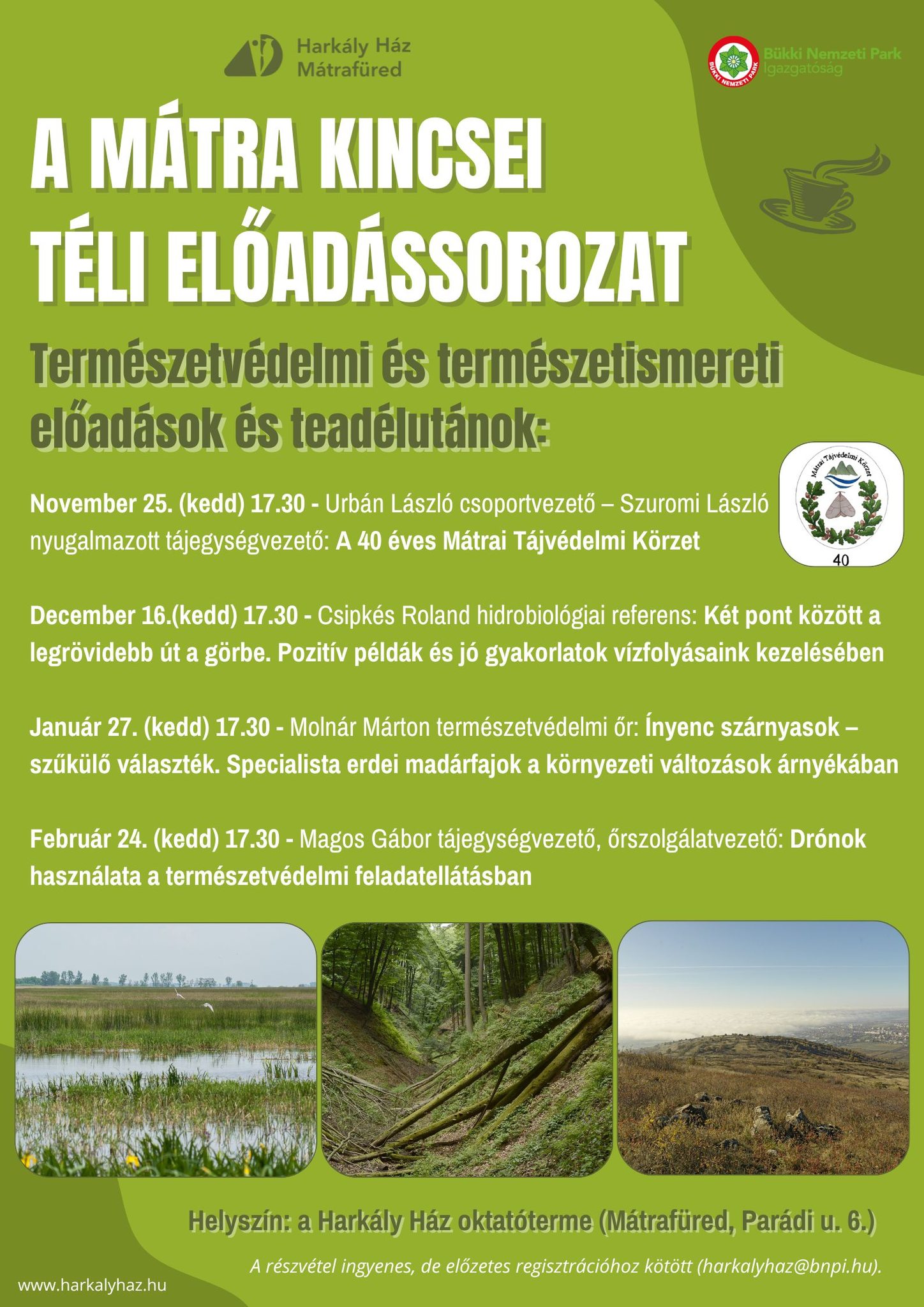 A korábbi évekhez hasonlóan novembertől februárig havi rendszerességgel, keddi napokon 17.30 órai kezdettel várjuk az érdeklődőket a mátrafüredi Harkály Házban természetvédelmi, természetismereti előadásainkkal. Programunk egyaránt szól a természetvédelem iránt érdeklődők és a szakmai közönség számára is. Tartson velünk, ismerjük meg közösen a Mátra természeti értékeit!