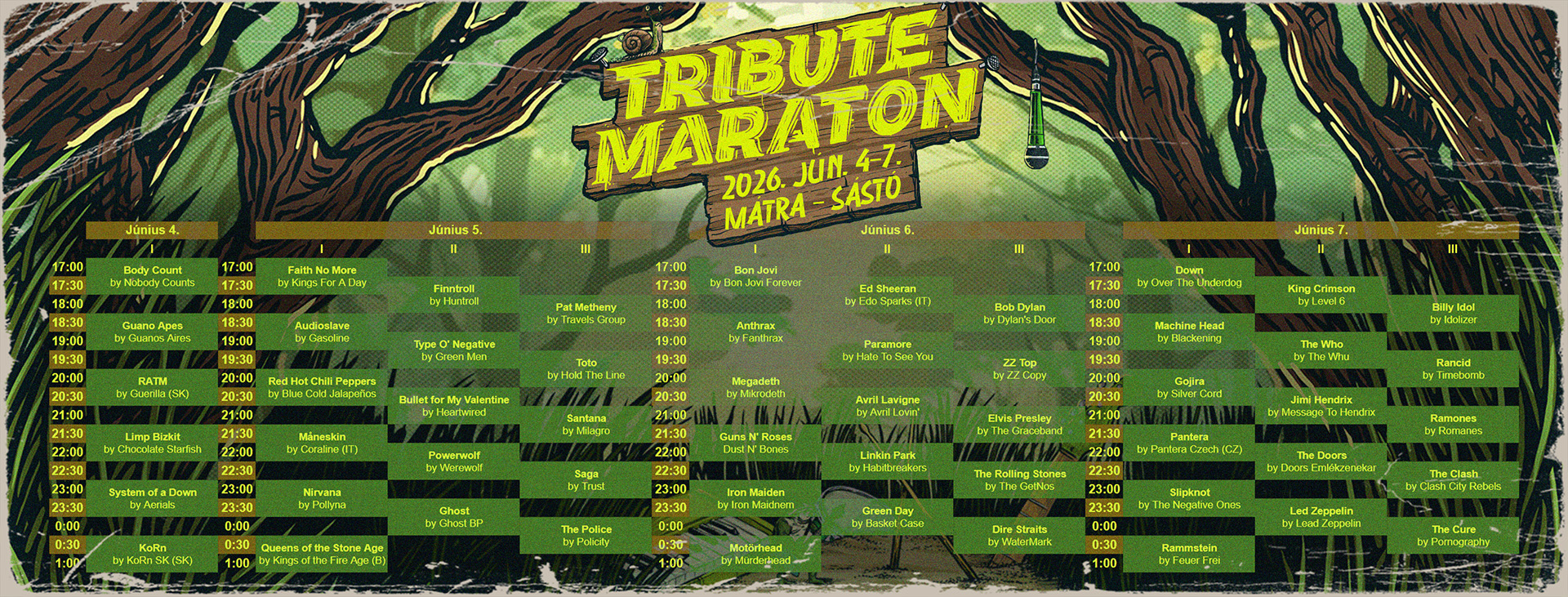 Az ország kedvenc tribute zenekarai a nagy elődök felejthetetlen műsorait hozzák el az észak-magyarországi fesztiválra, ami nem mellesleg a műfaj eddigi legnagyobb összejövetele lesz.