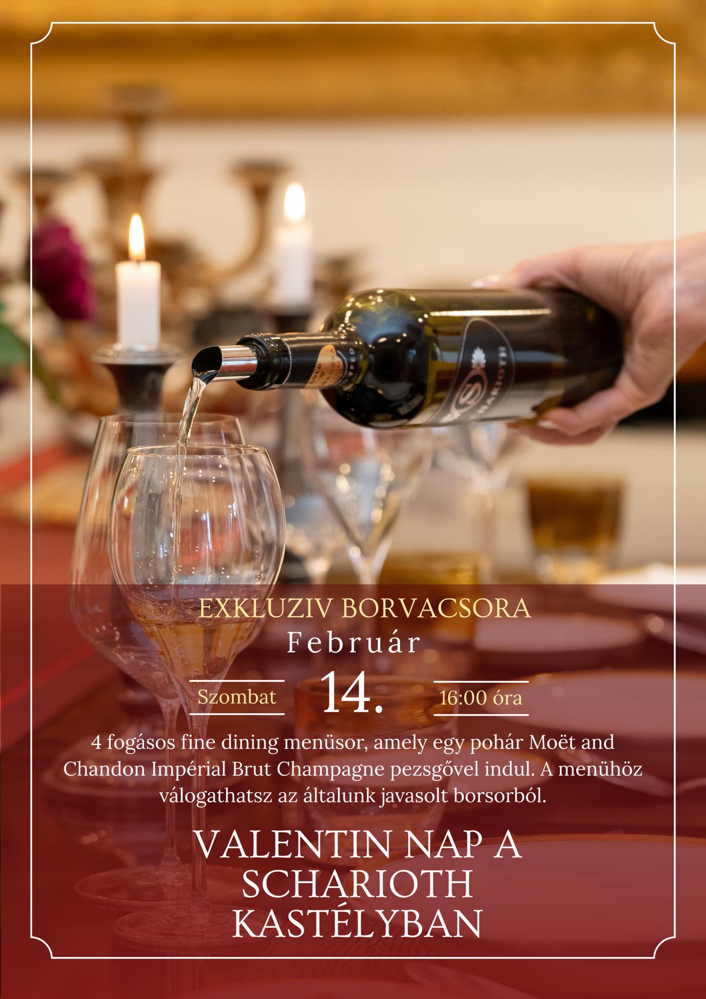 A vacsorát a kastély saját séfje készíti 4 fogásos fine dining menüsorral. Az est egy pohár Moët and Chandon Impérial Brut Champagne pezsgővel indul, amelyet gondosan válogatott 4 tételes italsor kísér: Szepsy Furmint (Tokaji Furmint 2015), Scharioth Sauvignon Blanc 2020 barrique, Frescobaldi Nipozzano Vecchie Viti Chianti Rúfina 2016 és Scharioth Kékfrankos Pezsgő 2019.
