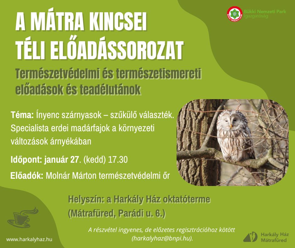 A korábbi évekhez hasonlóan novembertől februárig havi rendszerességgel, keddi napokon 17.30 órai kezdettel várják az érdeklődőket a mátrafüredi Harkály Házban természetvédelmi, természetismereti előadásokkal. A program egyaránt szól a természetvédelem iránt érdeklődők és a szakmai közönség számára is.