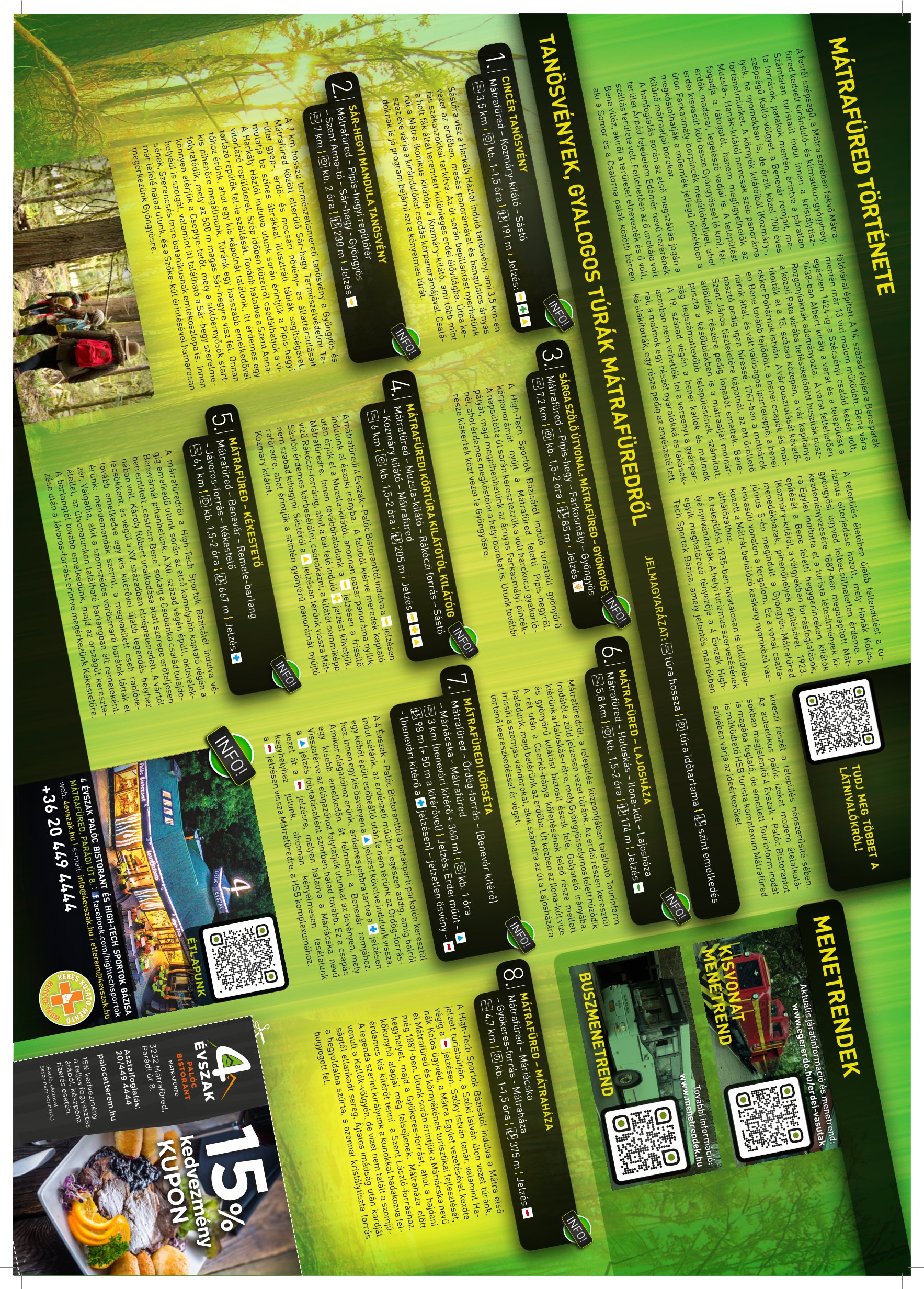 Mátrafüred orientáló térképen a település rövid helytörténete is olvasható. A térképen szerepelnek a legfontosabb túraútvonalak a busz-, és a kisvasúti menetrend is MatrafuredMátrafüred térkép hátoldal