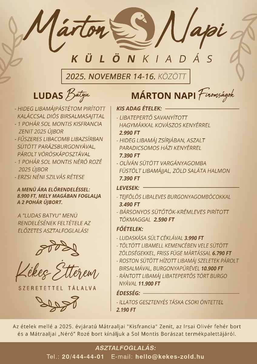 2025. nov. 14-16. között "Ludas Batyu" menüvel és "Márton napi finomságokkal" egészül ki á la Carte kínálatuk